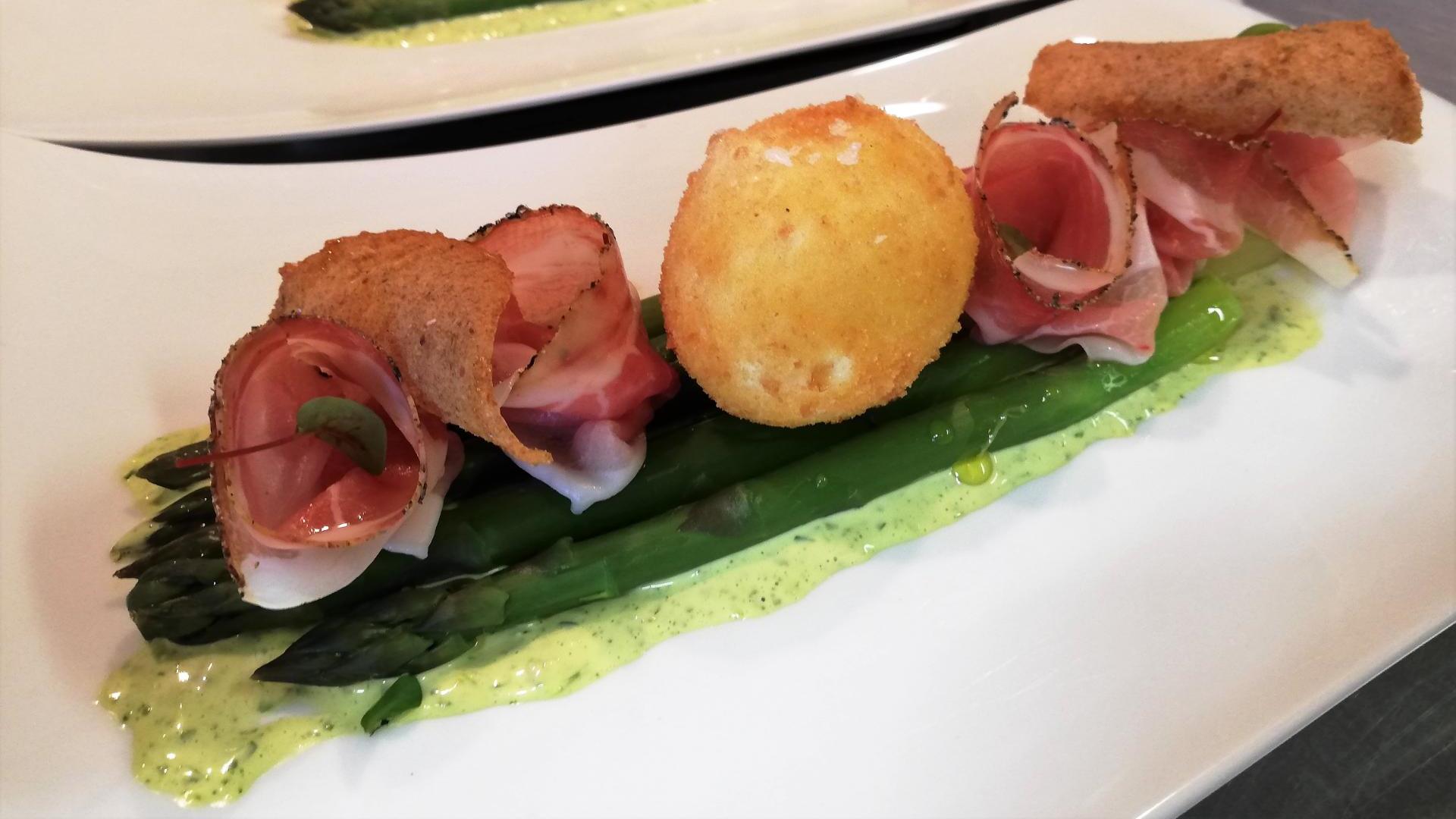 Rezepte Gebackenes Freilandei Und Junger Hausgeraucherter Speck Auf Grunem Spargel Mit Krautercreme